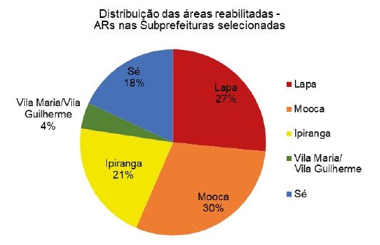 Quanto às áreas reabilitadas, observou-se uma maior concentração dessas áreas nas Subprefeituras Mooca (30%), Lapa (27%) e Ipiranga (21%), conforme observado na Figura 10. Esse padrão pode estar associado à proximidade dessas áreas com a malha ferroviária, que historicamente abrigou um expressivo parque industrial e passou, nas últimas décadas, por processos de intensa desocupação e requalificação urbana, despertando o interesse imobiliário nessas Subprefeituras, de forma a viabilizar o empreendimento. Nas Subprefeituras Sé (18%) e Vila Maria/Vila Guilherme (4%) observou-se uma menor incidência de áreas reabilitadas, provavelmente por não haver uma ocupação industrial tão intensa no passado e por ter interesses econômicos e imobiliários reduzidos comparados com as outras Subprefeituras, além da complexidade do gerenciamento ambiental, que pode estender o tempo necessário para atingir a reabilitação.